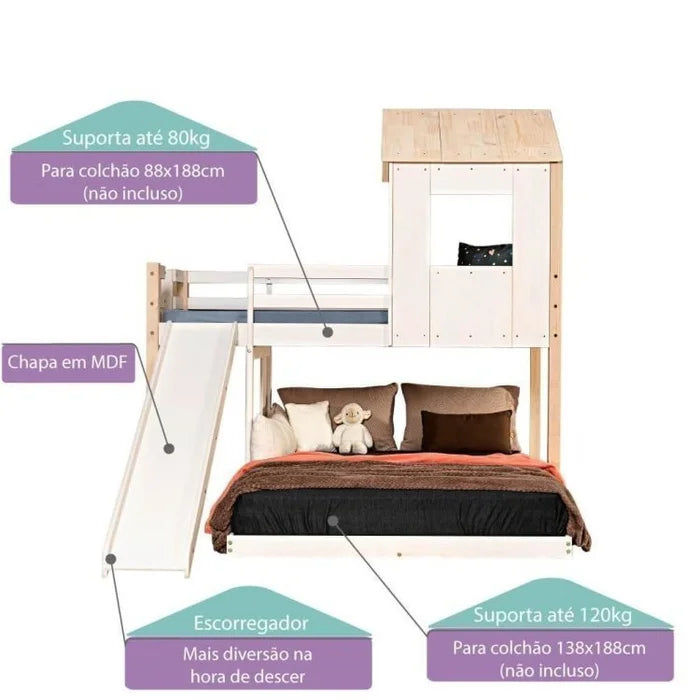 Transforme o quarto em um espaço mágico e funcional com o Beliche Casal Montessoriano com Escorregador. Desenvolvido pela Casatema, esse móvel exclusivo acomoda até três pessoas, seja um casal com um filho, uma mãe com dois filhos ou uma mãe solo com dois filhos. Seu design lúdico e seguro, aliado à estrutura robusta, proporciona noites tranquilas e brincadeiras divertidas durante o dia.