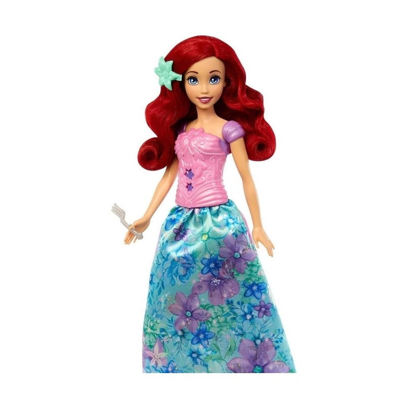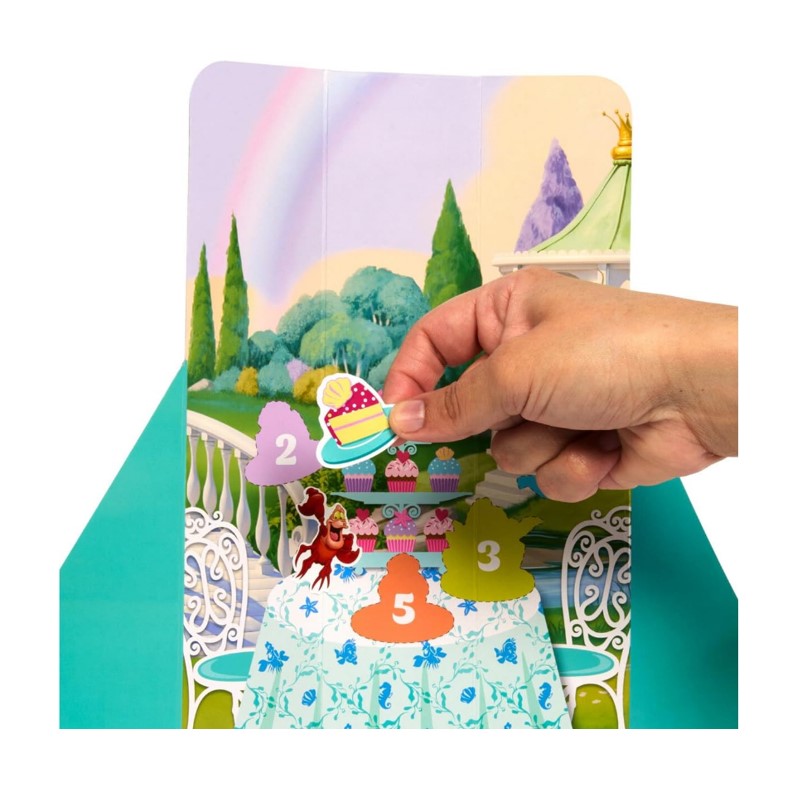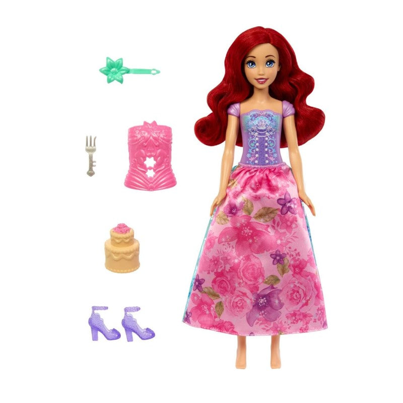 A revelação final é uma Boneca Ariel em um lindo traje floral! Uma saia reversível e um corpete de encaixe aumentam a diversão, e as crianças podem decorar o cenário da brincadeira e imaginar histórias com ele como pano de fundo. A boneca não pode ficar em pé sozinha. Inclui 1 boneca, 5 acessórios, 5 adesivos e 1 cenário para brincar.